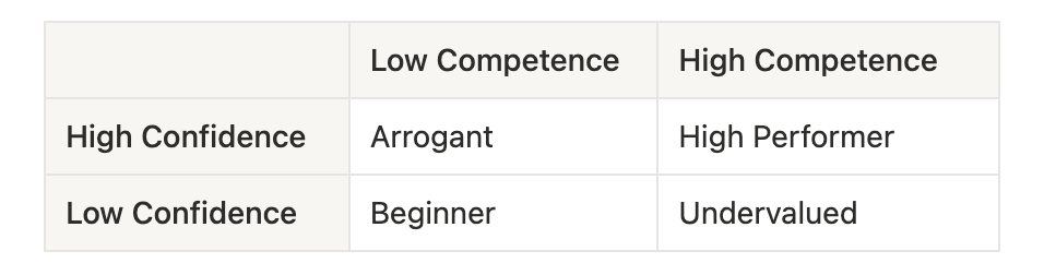 Along the way, our confidence and competence will inevitably fluctuate, and we’ll become arrogant or undervalued, so we have to remain self-aware enough to identify these gaps and course correct along the way.